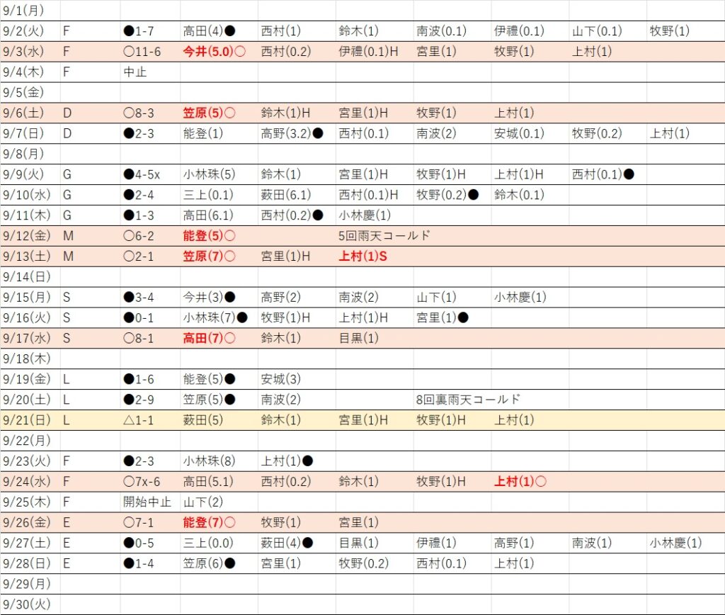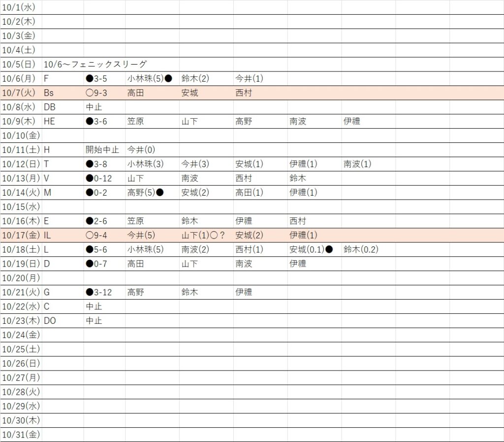 25登板表 2025.01.262025.10.26 ・勝ちパターン、負けパターンごとにだいたいどんな感じで継投されているか ・どれくらいの登板間隔で起用されているか をざっと把握する表です。(原則一週間が終わった日~月曜あたりに更新します) FacebookXBlueskyHatenaCopy