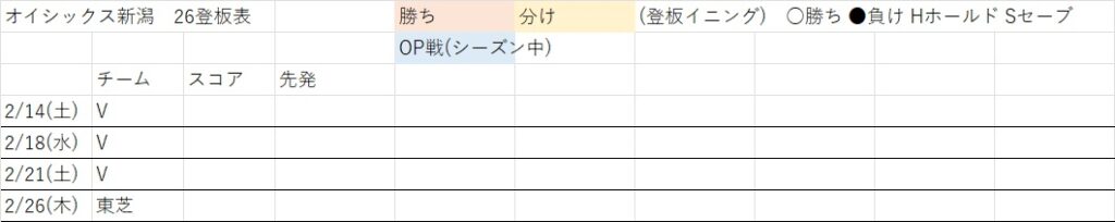 26登板表 2026.01.24 ・勝ちパターン、負けパターンごとにだいたいどんな感じで継投されているか ・どれくらいの登板間隔で起用されているか をざっと把握する表です。(原則一週間が終わった日~月曜あたりに更新します) FacebookXBlueskyHatenaCopy