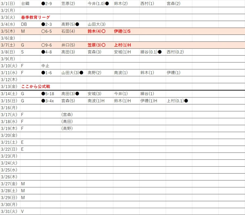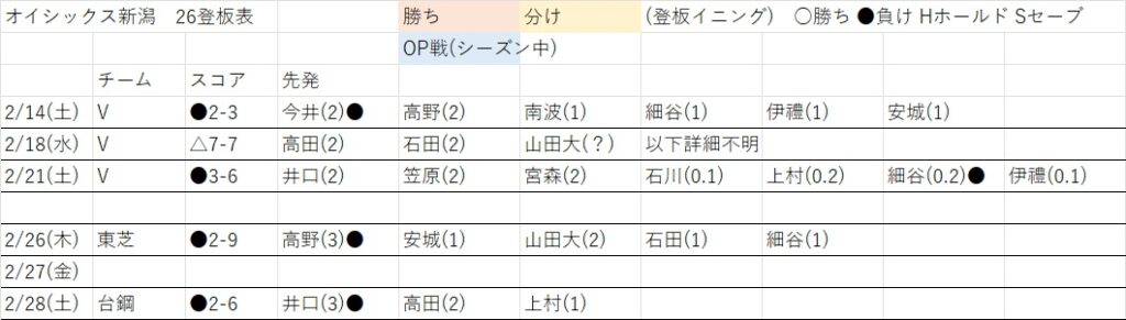 26登板表 2026.01.242026.03.16 ・勝ちパターン、負けパターンごとにだいたいどんな感じで継投されているか ・どれくらいの登板間隔で起用されているか をざっと把握する表です。(原則一週間が終わった日~月曜あたりに更新します) FacebookXBlueskyHatenaCopy