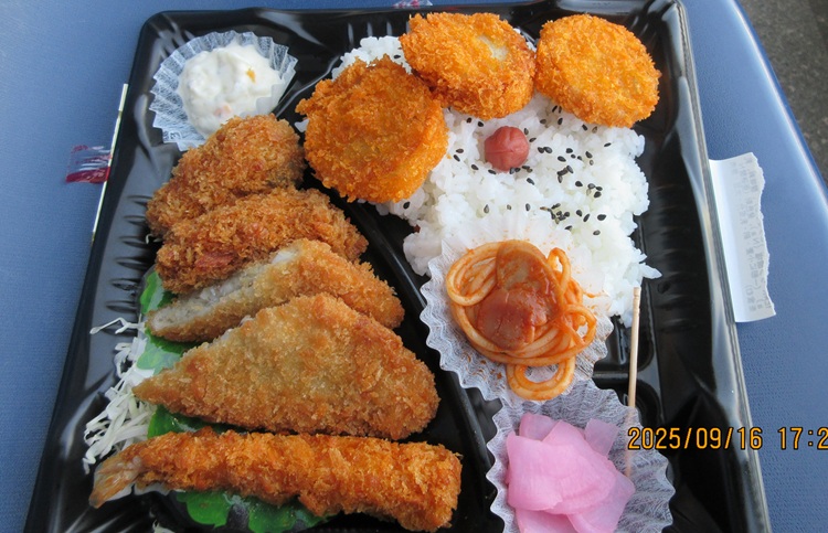 この弁当に角上売店の帆立フライをドッキングさせる。
