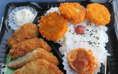 この弁当に角上売店の帆立フライをドッキングさせる。