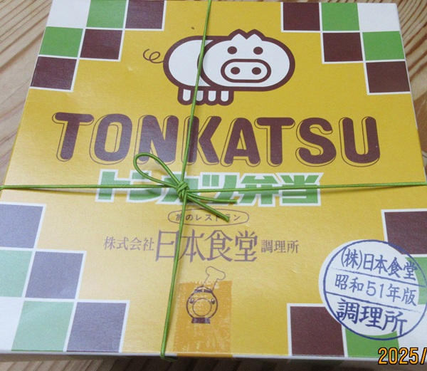 復刻とんかつ弁当。NREのさらに先代、日本食堂の名が入っている。もともと新幹線や特急の食堂車や全国各駅の構内食堂などを運営し、ついでに東京・上野の駅弁もという会社だった。JR東日本の傘下に入った今は、JR東日本全体の飲食をつかさどるほどに勢力を拡大している。