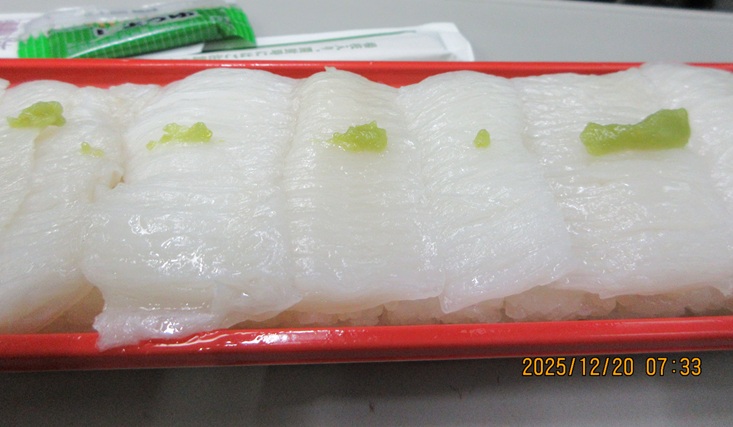 ヒラメえんがわが7切れ乗っかった押し寿司。悩ましいのは添付の醤油を使うかどうか。自宅で食べる時は皿にしょうゆを出して、醤油はほんのわずかちょんちょんと一滴つくかどうかで食べるのだが、車内だとこの一滴が難しい。間違ってドバーっとかけてしまうと、ヒラメの淡白な味わいが台無しになってしまう。