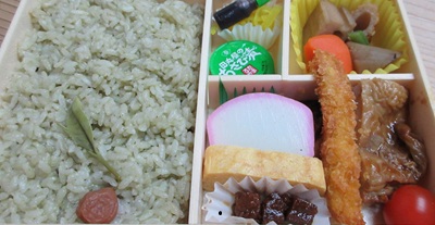 静岡駅で買ったこの旅最後の駅弁。昨日の幕の内弁当同様の幕ノ内系だが、ごはんをお茶っ葉で炊いて緑の茶飯にしました、というのがポイント。あとおかずも若干豪華になり、エビフライがでかい。鳥の照り焼き。マグロの角煮など。