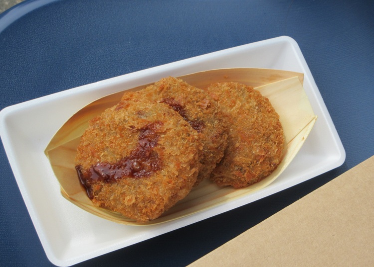 ということでサイドメニュー。新製品のタコメンチ。いわゆる世間でいうところのタコキャベツカツですね。2個ソース、1個ソースなしで。ソースは小袋ではなく、売り場備え付けのボトルからかける形に。