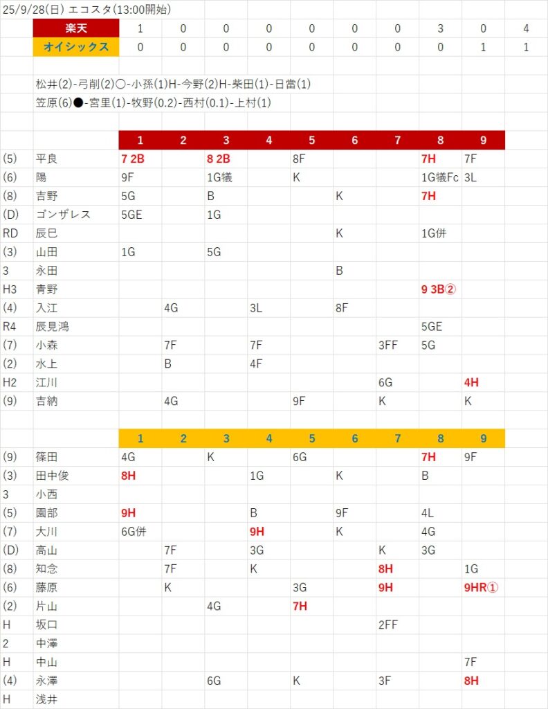 そんな笠原の好投に応えて最終戦を飾りたい、我らがオイシックス打線だったが、今日は実にモヤッと。初回一死一二塁を併殺でつぶすと、小刻みに継投する楽天投手陣から塁には出るものの、あと一打が出ない。