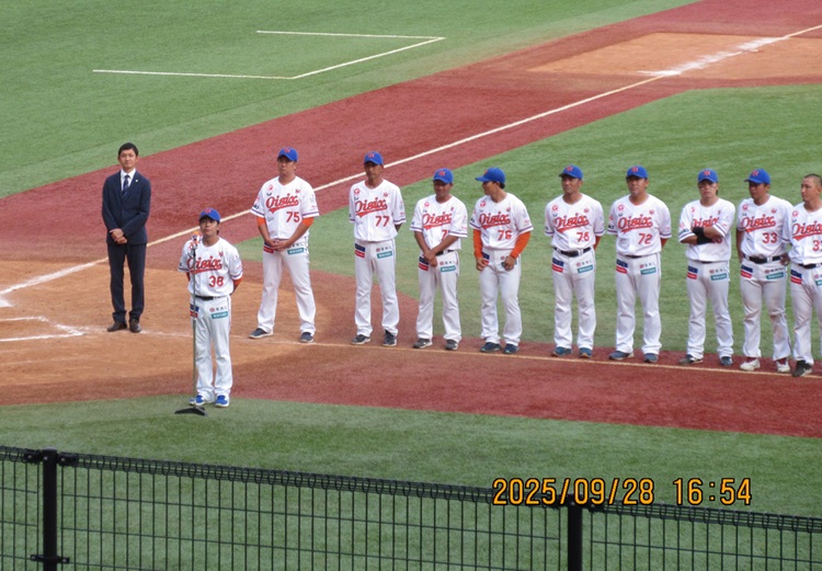 終了後選手コーチ池田社長が一塁線上に整列。勝さん、小西主将、池田社長の順であいさつ。