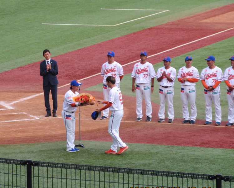 退団する薮田投手に花束贈呈。合わせて応援団から『ありがとありがと薮田』コール。もう一つ、これで派遣を終えソフトバンクに戻る宮里投手にも『ガンバレガンバレ宮里』コール