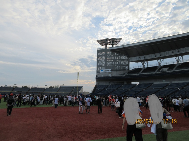 グラウンドに入って記念撮影終了後は、いよいよお見送りタイム。結構列は長く、これは本気で選手に挨拶したい人の邪魔になるのでワシはグラウンド撮影でもしてましょうかね(列は長くとも滞留はあまりしてなくて回転はしてるが依然長いままという感じだったらしい、ざっと聞く限りだが3人くらい選手と挨拶というのが平均的)