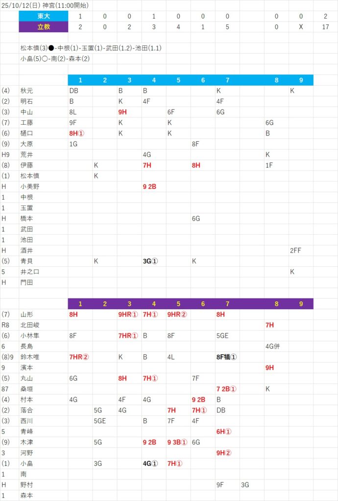 もう一点。この時期のアマチュア野球を見ると、気になるのはやはりドラフト候補と言われる選手。この試合だと立教の1番山形選手。3年まではちょろちょろと試合には出ていたがレギュラーにはなれず、この春レギュラーになるといきなりリーグ戦の三冠王。一躍注目を浴びるようになった。