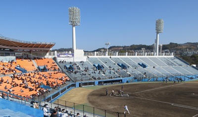 ヤマハ主催の交流試合、入場無料。ヤマハは昨日までこの球場でキャンプを張っており、この後九州方面へ遠征。キャンプの打ち上げというか、新チームを静岡県民のみなさんにお披露目といった位置づけの一戦。無料なのは取ると、むしろ球場使用料が跳ね上がるからなんですかね。