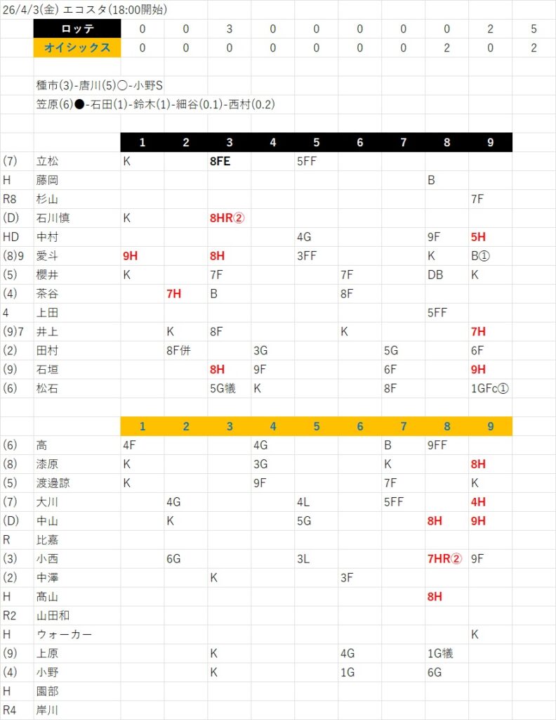 その種市。球速こそ140後半が最高速だったが奪三振6のパワーピッチで圧倒。このまま5回まで行くのかなと思ったが帰国初登板なので3回でお役御免。変わって大ベテラン唐川。これまた老練のピッチングでのらりくらりと打たせてとってオイシ打線に出塁を許さない。