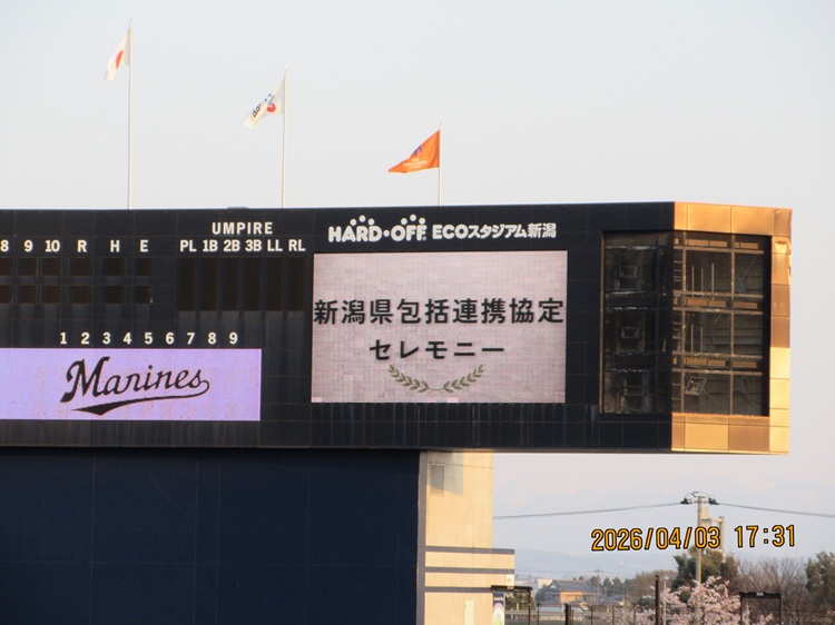 試合前に新潟県とオイシックス(本社)との包括連携協定締結セレモニーが行われました。