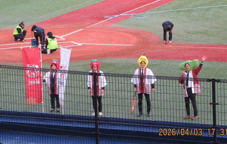 併せて県農業部の方が名産の被り物で出演あいさつ。今日のボール投げ入れの賞品には県提供の越後姫などがふるまわれたようです。