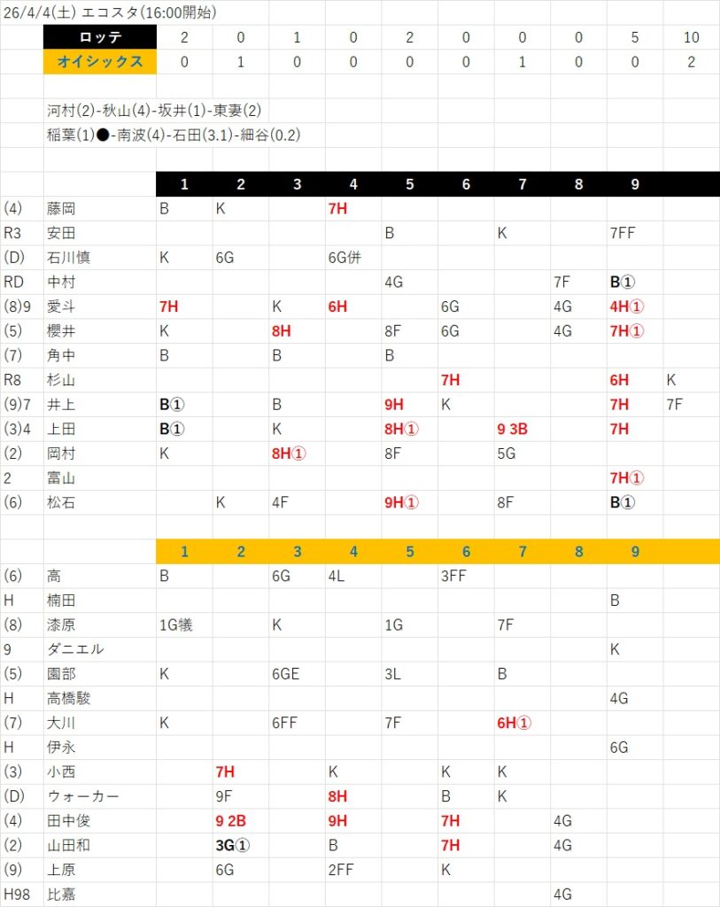 26/4/4(土) オイシックス●2-10ロッテ(エコスタ)