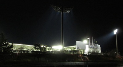 午前中は何とか持っていた雨もぽつぽつ降りだした。スポーツ観戦者の常備品・大ビニール袋で荷物を包んで屋根のかかる最上段ないし通路で試合開始を待つ。