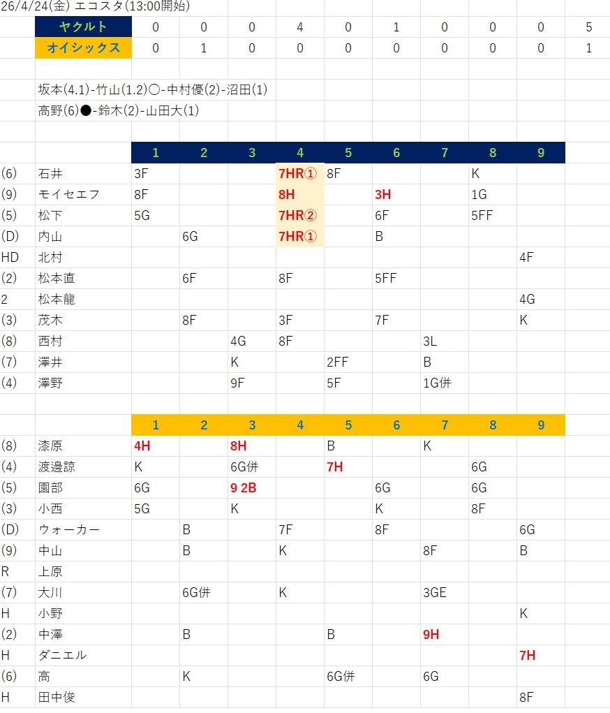 オイシックス先発は高野。前回4/17(金)日ハム戦では、0-5の4回表から登板。6回無失点とある意味ものすごくもったいない好投をした。