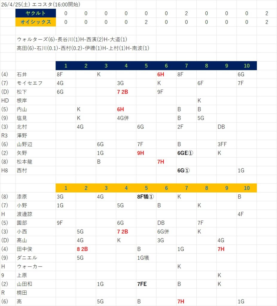 先発は開幕KO以降、QSを続け今季3勝1敗の高田。ヤクルトはうちには好投するが一軍ではボコボコにされて帰ってきたウォルターズ。ある意味オイシックスキラーの趣が漂う。