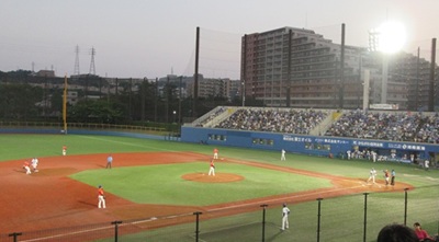 昼間は何とか涼しいところでしのぎ、宿に荷物を置いて、日が落ちかけたころに球場へ。蒸すが風もまあ出ており、何とか初戦のナイターは耐えられそう…