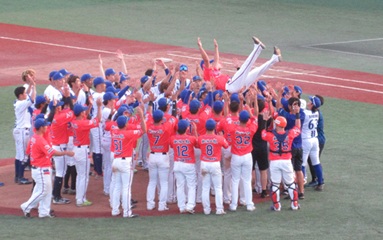 ちょろっとだけ試合の方も。灼熱の中2-2の同点のまま5回裏へ。ここで先発薮田から2番手南波へ。今日は連戦最終日なので9回打ち切り。投手も南波含めてあと5イニングを5人で済むので、早めの継投でいいのでしょう。