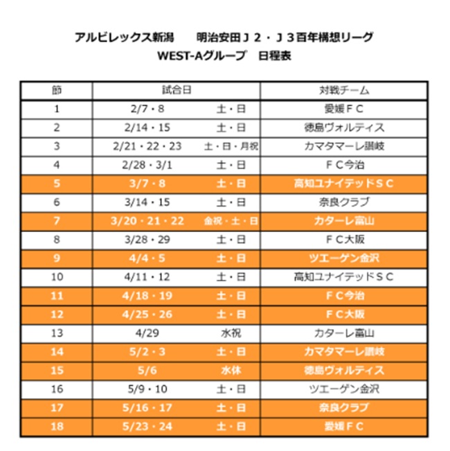 本日(12/19)発表されたサッカーアルビの試合日程。26/8から秋春制へのシーズン以降に伴い、26年前半は特別編成のリーグ戦。シーズン開幕は2/7or8。さすがにこの時期に新潟で試合など叶わず愛媛松山での開幕。その後も4戦連続で四国アウェイ。アルビは高知キャンプからそのままトレーニングを現地で継続して、高知から四国内の会場へ。新潟にはホーム開幕まで帰ってこないんでしょうね。