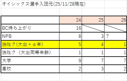 まあ地元や特定の大学が多いのは地縁人縁なんだろなと思います。24年の入団選手もBCからの在籍選手の後輩だったり。