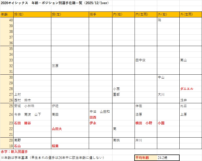 まあ新入団選手の時点で年齢が若返るのは当然なのですが(この先元NPBとかで25歳近くまで戻る)、現在の在籍(新人含む)選手が40人、昨年の開幕ロースターが49人だったのでこの後7~8人くらいは元NPB+追加アマ選手で増えると思います。