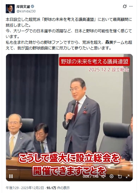 岸田文雄元総理「野球の未来を考える議員連盟」最高顧問就任とのこと。左に着席しているのが王貞治ソフトバンクホークス会長。これがまあ「子供が野球離れだから普及に力を入れよう」みたいなのんきな団体なのか? というよりは安倍政権で打ち出されたNPB16球団構想がまた復活してきた印象に見えるなあ…