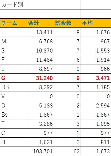 休日昼>休日夜>平日夜>平日昼。まあ当たり前っちゃあ当たり前ですね。今後はやはり平日のナイターを増やしたい→エコスタ集中化が進むか?