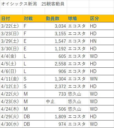 球場別でみるとやはり公共交通のないみどり森、三条、ベーマガが1,000人を切って伸び悩む。まあその辺は今年の日程にもキッチリ反映されて、みどり森0,三条も3試合。
