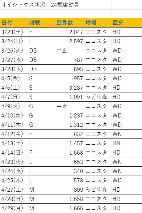 傾向は25年とほぼ同じ。この年は春先にエコスタ平日デーゲームが多く組まれ、序盤観客動員が伸び悩んだ。あとは西武戦の動員の少なさ。新潟にファンが少ない? 二軍戦に行くくらいなら一軍戦に行っちゃう? (最終的には売切れ近くまでもっていくものの、売り出し時点ではどの試合もチケットを入手できる)