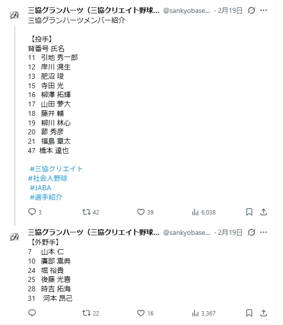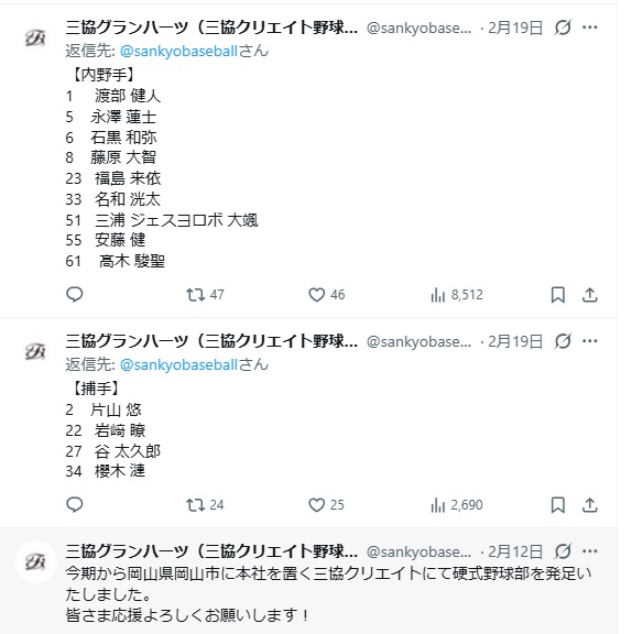 岡山市の建設会社三協クリエイト社(かつて長野で活動していた名門三協精機とは無関係の模様)が野球部を結成し、昨年までオイシックスでプレーしていた藤原・永澤・片山の三選手が入団したことが同チームXより公表されました。