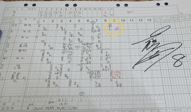 ちなみにこちらがサポ感の時の藤原選手と安城投手。およびサインしてもらった24年みどり森中日戦でサヨナラ打を放った試合のスコアシート。