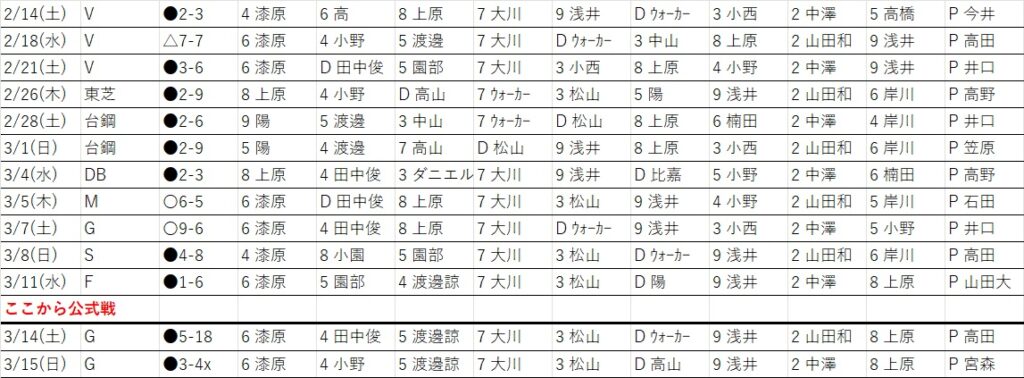 | 3/14(土) | G | ●5-18 | 先発以下繰り出す投手打たれ大量失点 ウォーカー① 松山① |