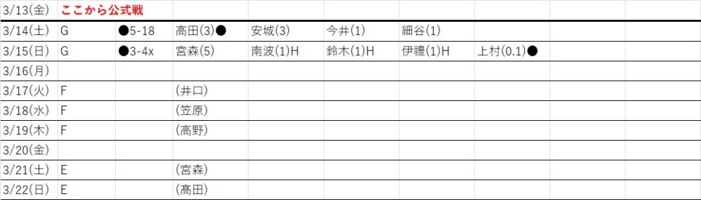 | 3/15(日) | G | ●3-4x | 6回中澤2点タイムリー3塁打で勝ち越すも、 9回守護神上村打たれ逆転サヨナラ 開幕は無念連敗スタート |