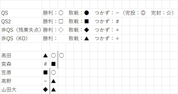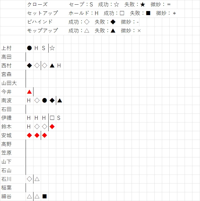 黒記号が多いと、「登板結果が悪いな」と一発でわかるのがこの表。好調なのは伊禮の1S3Hくらい。あとは上村は開幕直後はこんなもんで、ボチボチ調子あげてこかみたいな感じ。