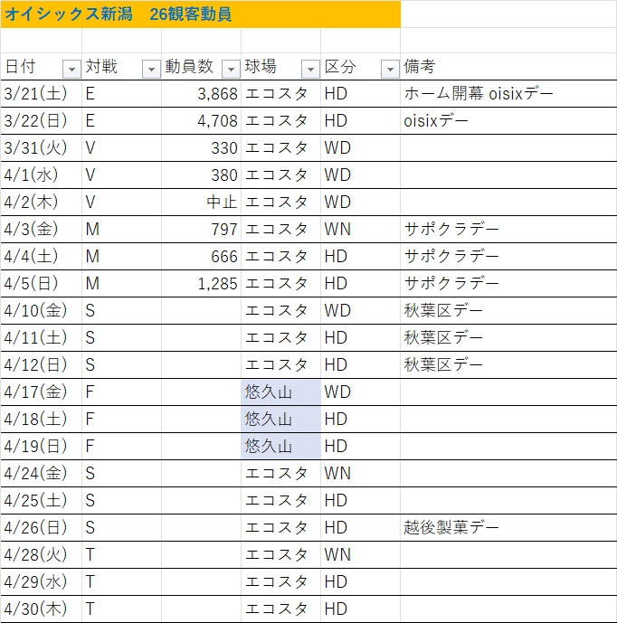 まあまだ何かを語るべきものはないですね、春先天候が安定しない新潟はこんなものでしょう。ハヤテ戦は二日とも300人台をたたき出しましたが、昨年も4月頭の平日デーゲーム西武戦で600人台だったこともあり、ことさらどうこうではなさそう。