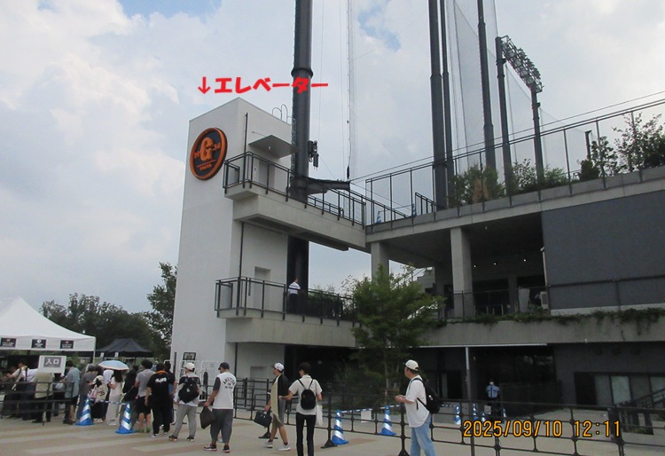 入場口そばのGマークが入ったタワーがエレベーターで、入場口、1階スタンド、2階スタンドともにバリアフリーで移動可能。