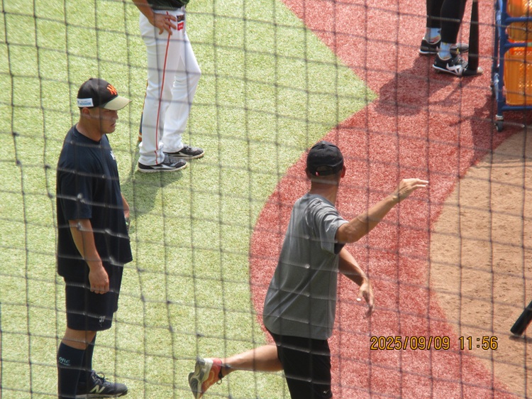 中山選手に打撃指導する和田臨時コーチ。上がスイングについて、下が重心の掛け方について極端にイメージさせた指導といったところか。