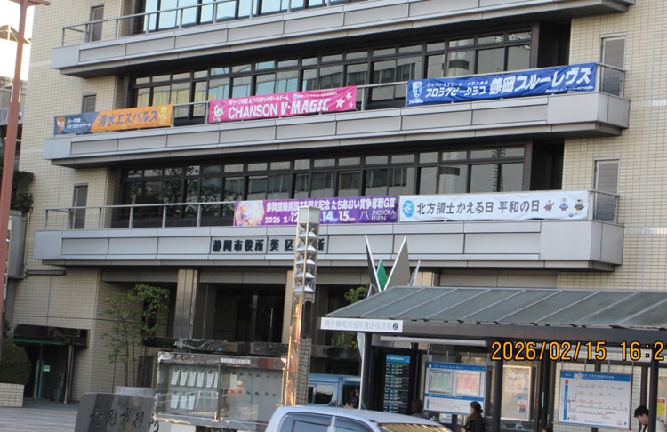 静岡市葵区役所左からエスパルス、シャンソンVマジック(女子バスケ)、静岡ブルーレヴズ(ラグビー、元ヤマハ発動機ラグビー部)