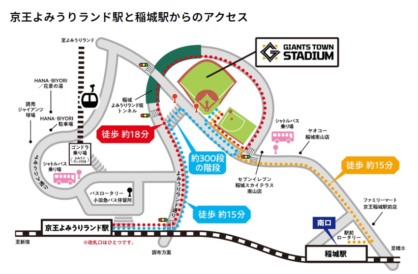 ジャイアンツタウン自体出待ち等でかなり遅くまで残る人も多く、帰りが分散されているようだ。なのでシャトルバス利用を本命としつつ、乗れそうになければ稲城駅かよみうりランド駅(ループトンネル経由)への徒歩というルートをおススメしたい。