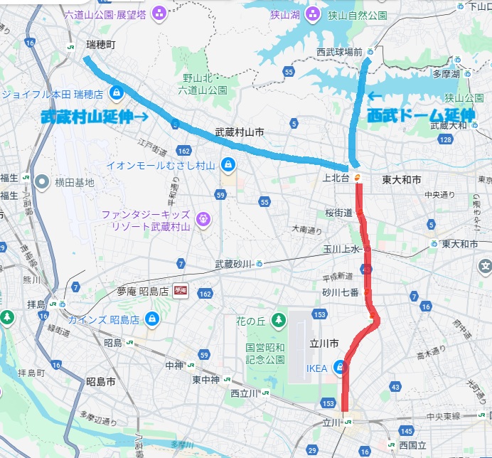 この先の延伸計画はまず鉄道のない市・武蔵村山(志村けんの出身地・東村山と紛らわしい)を経由して瑞穂町箱根ヶ崎に至るルート。こちらはもう路線の免許もおり、後は作るだけの状態。