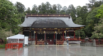 帰りは本殿からまっすぐに延びる表参道経由で山を下りる。長い急こう配の石畳階段。手すりも満足とは言えず、石畳も雨でぬれている。これはかなり往生しました。
