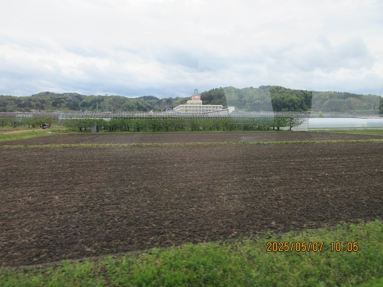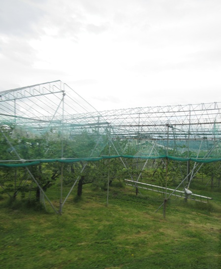 車窓に広がるのは桜の木。他地方では桜は花が散ったらその年はもう用済みだが、ここではこの先が大切なまさに「お金のなる樹」なのだ。