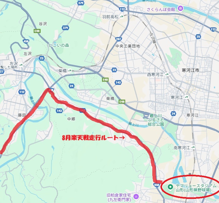 まとめると8月楽天戦の走行ルートと左沢線の関係はこんな感じです。