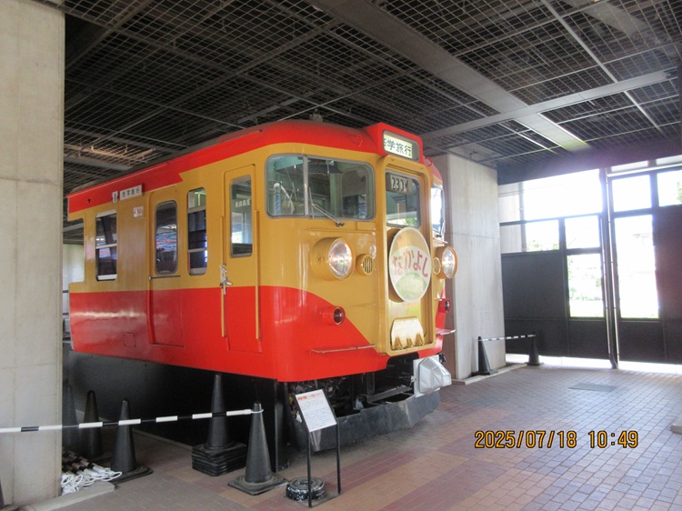 入り口では修学旅行用電車がお出迎え。主利用者が中高生という特徴を生かして、普通なら4人+4人のボックス席を両側に並べるところを4人+6人のボックス席に詰め込んで大量輸送を可能にした。