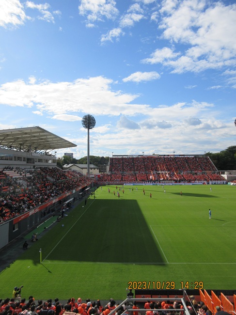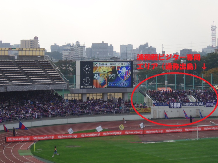 浦和戦だとレッズサポでスタンドを埋め尽くすので、ビジターサポは端っこのビジター専用席(形状からサッカーファンの間では「出島」でおなじみ)に押し込められるが、大宮戦でそこまで埋め尽くすことはかなわないので普通にビジターサポに半分開放。