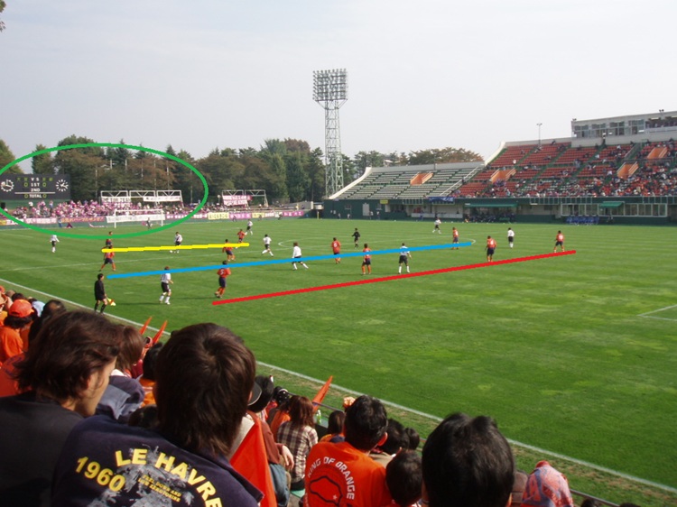 バックスタンドから。こちらも臨場感抜群。メインスタンドはこちらは近すぎて、メイン寄りのラインが見切れて見れない。そして大宮といえば4-4-2の3本ライン。DF(赤)-MF(青)-FW(黄)の三本のラインがまっすぐコンパクトに保たれて、ボールと連動して上下に移動する。このディフェンスの堅さが大宮の売り(だった)。